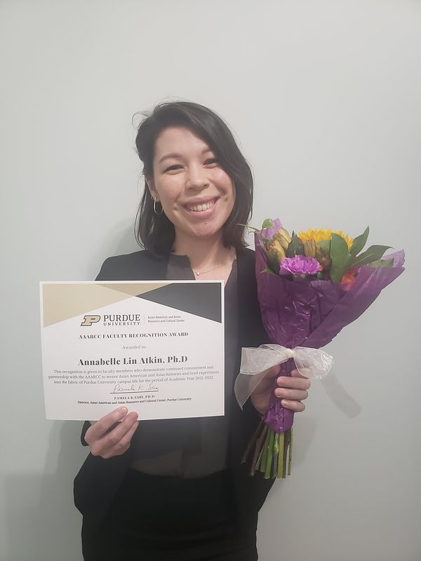Dr. Annabelle Atkin joined Purdue University’s Department of Human Development and Family Studies in the fall of 2021. Annabelle identifies as a Biracial Asian American woman. She was raised in the suburbs of Cleveland and later college town of Storrs, Connecticut, by her Taiwanese-Chinese immigrant mother and White father. She earned her Bachelor's degree in Psychology and Asian & Asian American Studies at the University of Connecticut . She then taught English in South Korea for two years.  Annabelle graduated with her PhD in Family and Human Development from Arizona State University, where she worked with Dr. Brandon Yoo. She also worked as a postdoctoral researcher at Arizona State University for one year with sociologist Dr. Nilda Flores-Gonzalez before coming to Purdue.